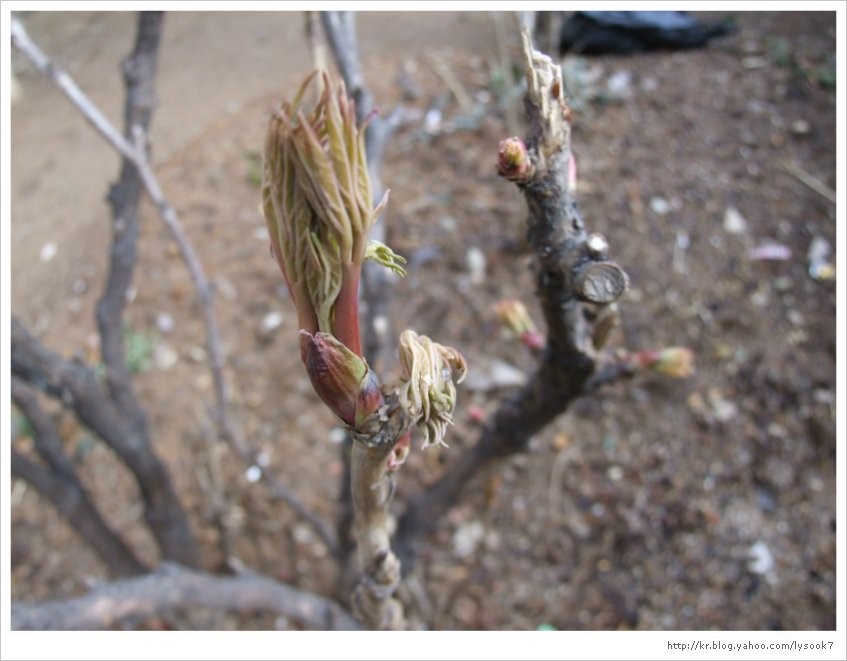 작약은 위 사진에서처럼 땅 속에서 새순이 나옵니다. 줄기가 없습니다.