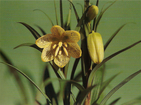 연한 녹빛 노란색 꽃잎에 짙은 그물무늬가 잡혀 있어