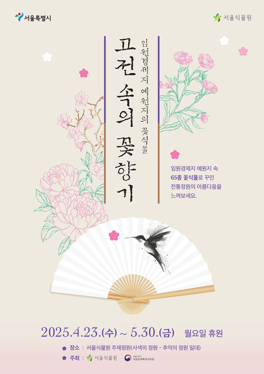 서울식물원에서 조선 정원의 미학을 담은 전시, 《예원지(藝苑志)》展이 열리고 있습니다. 조선 후기 실학자 서유구가 집필한 《임원경제지》 속 정원 예술서 『예원지』를 기반으로 한 이번 전시는 65종의 전통 꽃과 정원식물을 통해 조선의 계절감과 생활 철학을 엿볼 수 있는 뜻깊은 자리입니다.